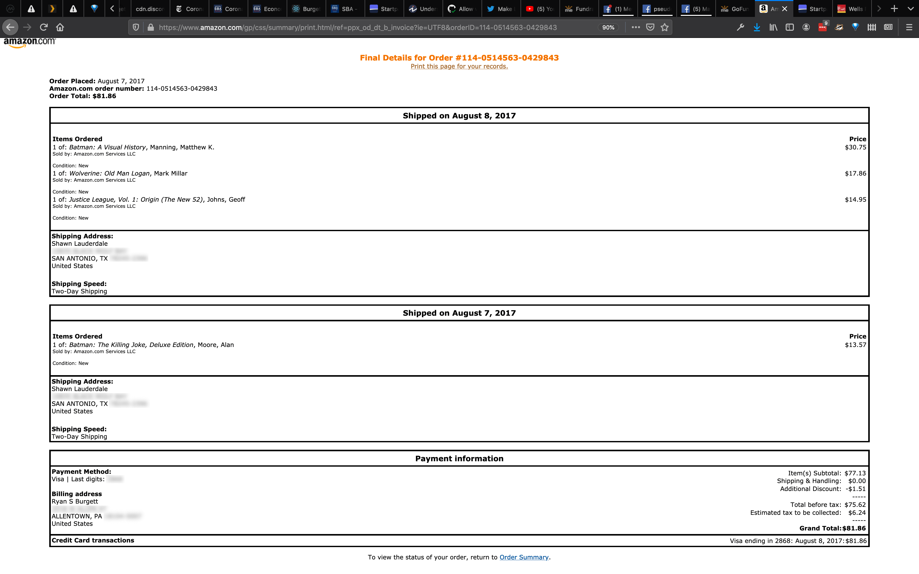 I have collected private messages, screenshots from my bank and Amazon, and the proof of payment direct from Wells Fargo. Multiple friends were involved in the private conversations I will share, so I have made every effort to protect their privacy and conceal their identities. In the same way, I have concealed my own sensitive information including bank acount numbers and my full address. I have done the same for Shawn. I am in Allentown and he is in San Antonio, but nobody else needs to know our full addresses and phone numbers. The people involved in the private conversations have been given full, unredacted versions of the same conversations listed here so that they can comfirm their veracity if they so desire.